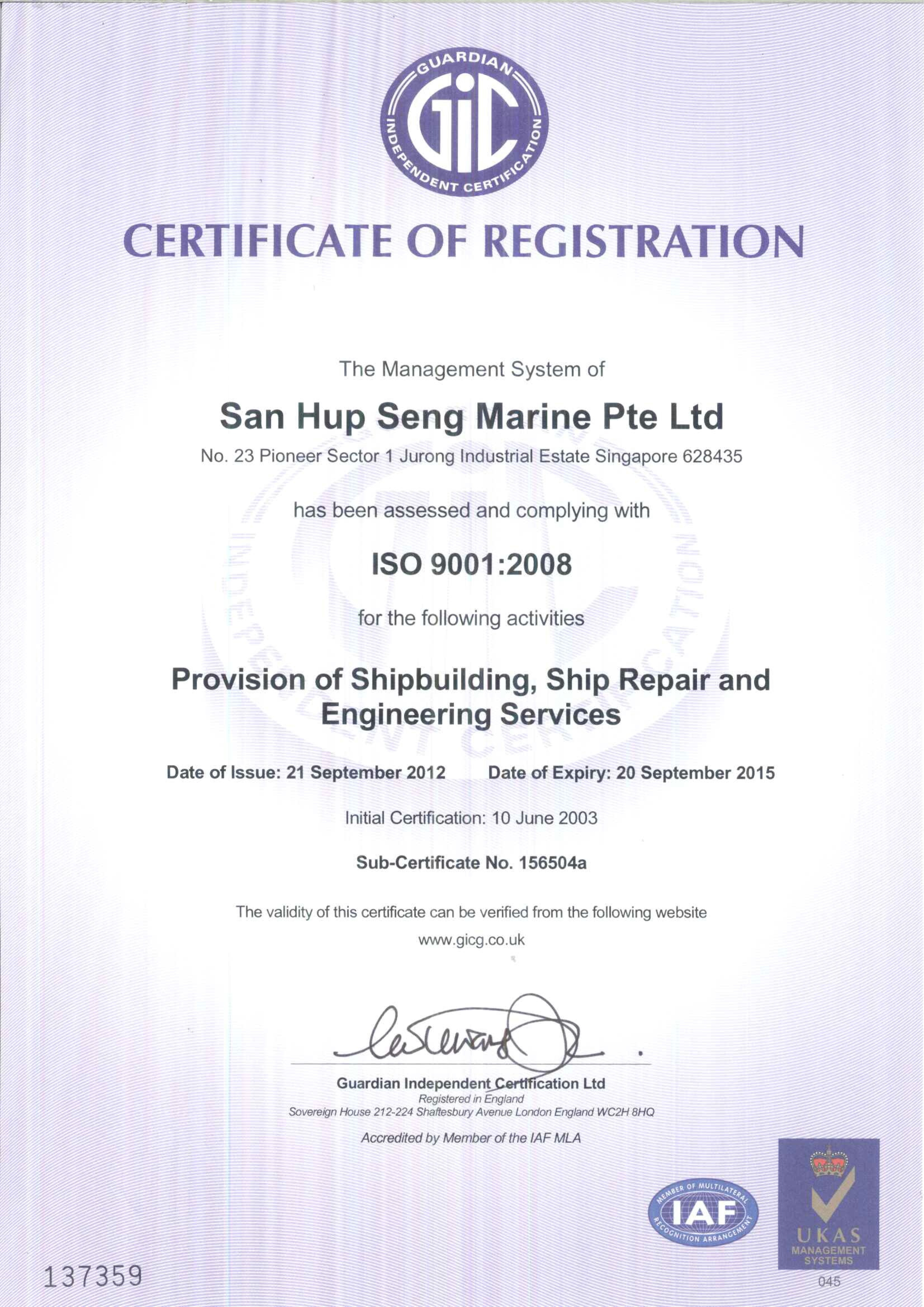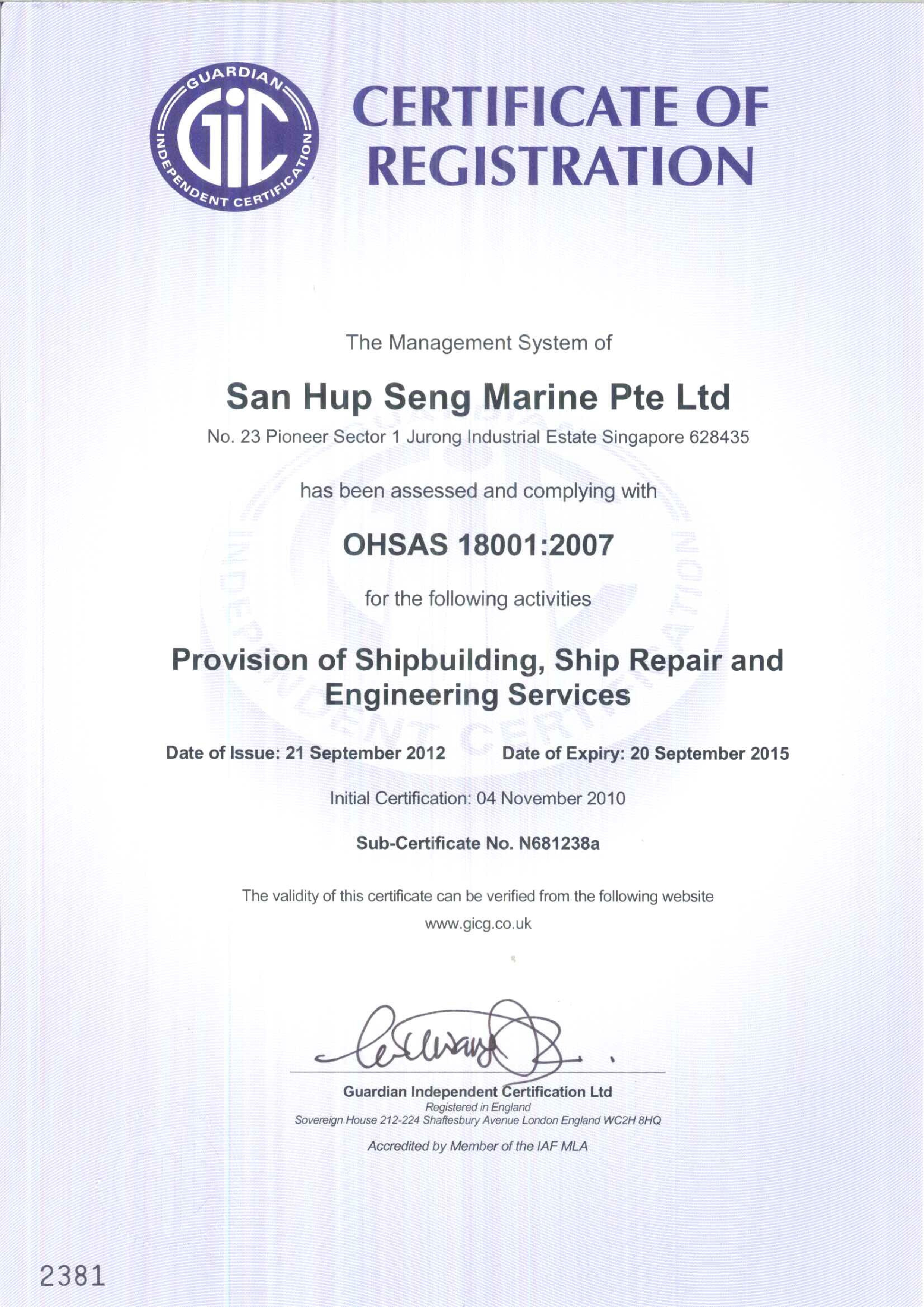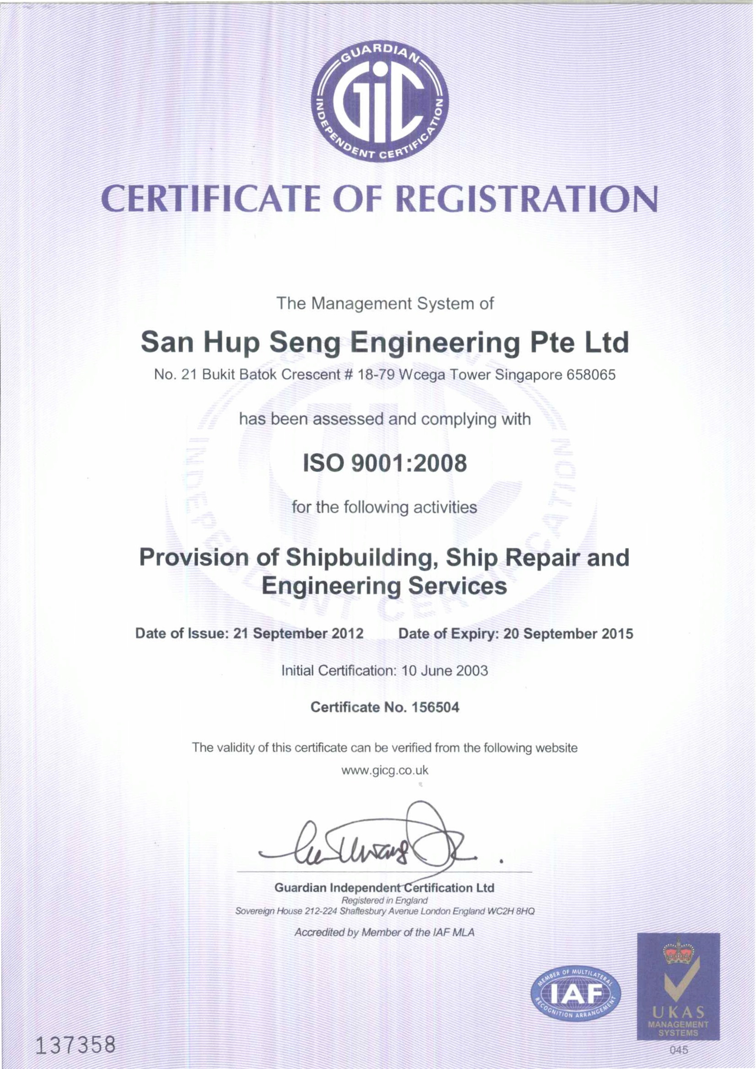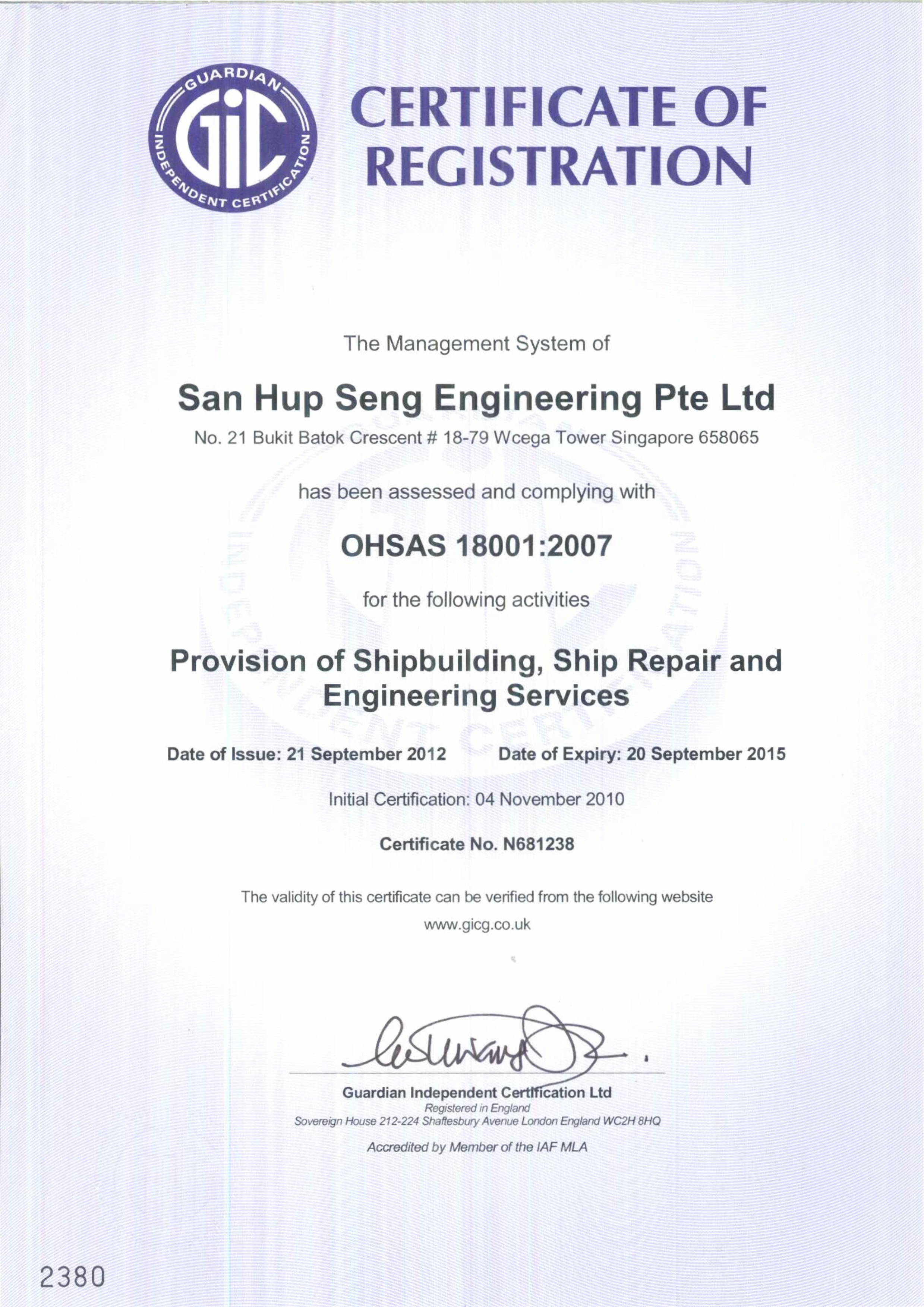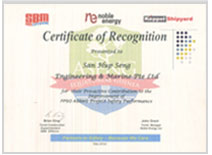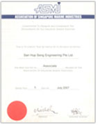 | ISO 9001:2008 (SHSM) | ISO 9001:2008 (SHSE) | OHSAS 18001:2007 (SHSM) | MEMBER OF SINGAPORE BUSINESS FEDERATION | MEMBER OF ASSOCIATION OF SINGAPORE MARINE INDUSTRIES | OHSAS 18001:2007 (SHSE) |
